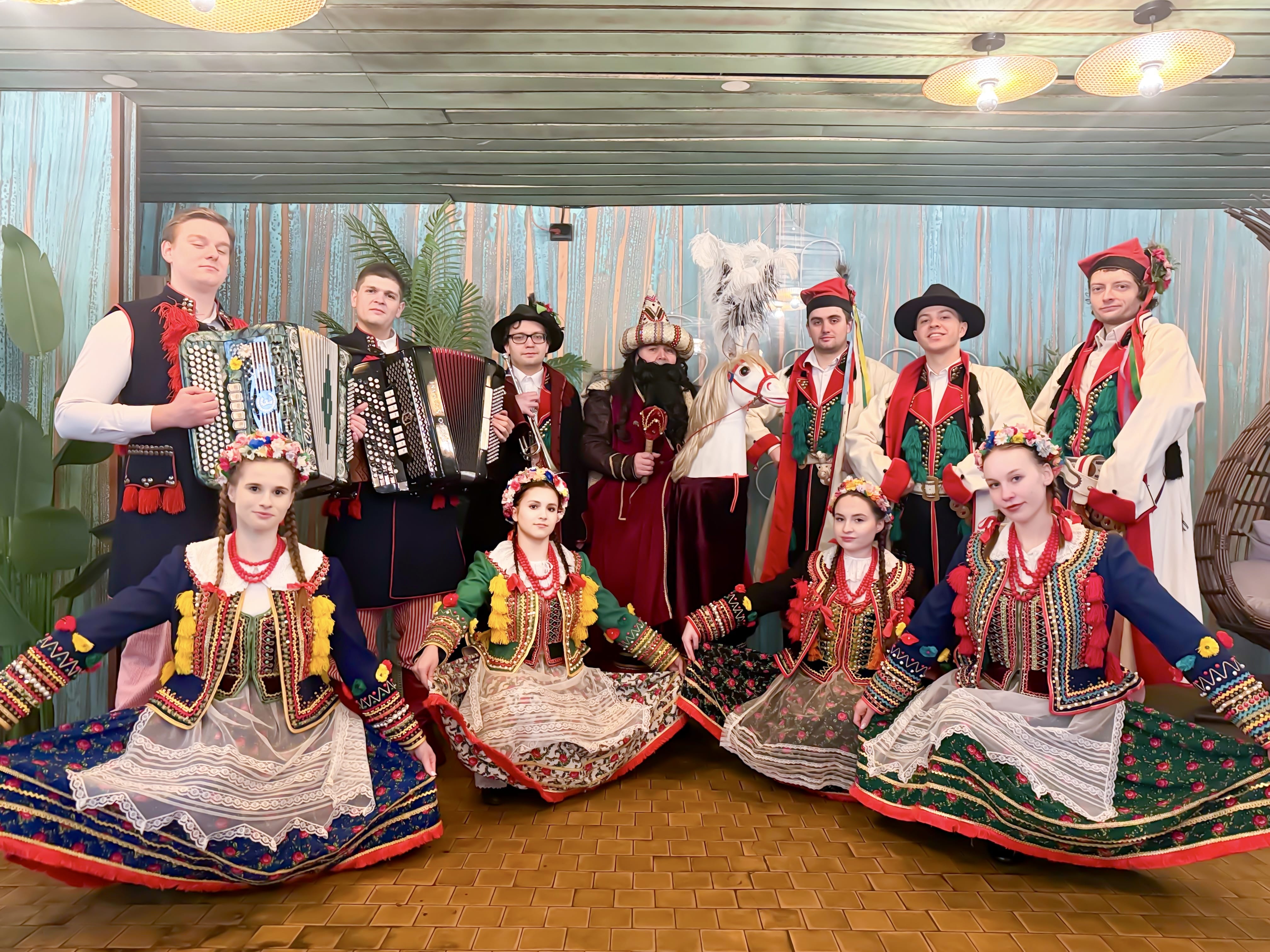 Interactive music and dances, meet the Lajkonik, and learn Polish legends. Conclude with a celebratory toast.